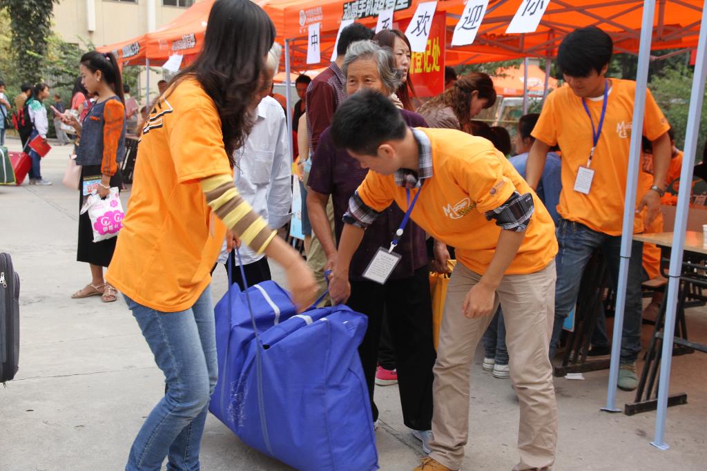本网讯 9月5日的威廉希尔williamhill里,飘扬的彩旗、欢迎的宣传横幅、大红的标语、各式的宣传海报把整个校园点缀的喜庆耀眼,现场气氛热烈非常,迎新报到工作紧张有序。一辆接新生的车开进校园刚刚停稳,热情地校园志愿者就迎上来,帮着提行李、分发报到流程单。中文系广电1201班的冯同学就是校门口服务的志愿者,来自陕西延安,她说,虽然迎新工作很辛苦很紧张,但能够为学弟学妹服务让她非常高兴,同时也能够提升自己处理突发事件的能力。