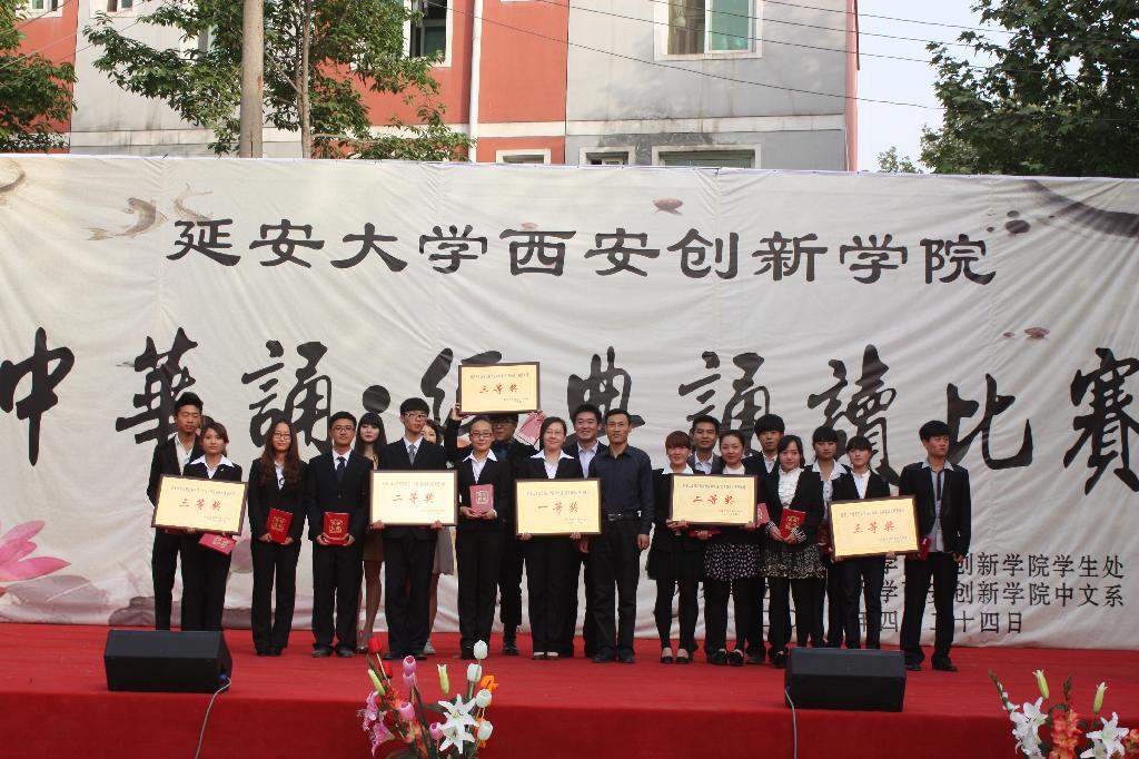经过激烈的角逐,中文系的《啊!我的关中》诵读团队获集体组一等奖,外语系的《我的祖国》和建工系的《送你一个长安》诵读团队获集体组二等奖,医学系、经管系和艺术系选送的诵读团队获集体组三等奖;中文系董大为同学获个人组一等奖,建工系张昱同学和中文系朱盼月同学获个人组二等奖,中文系高胜寒和外语系王文洁同学获个人组三等奖。