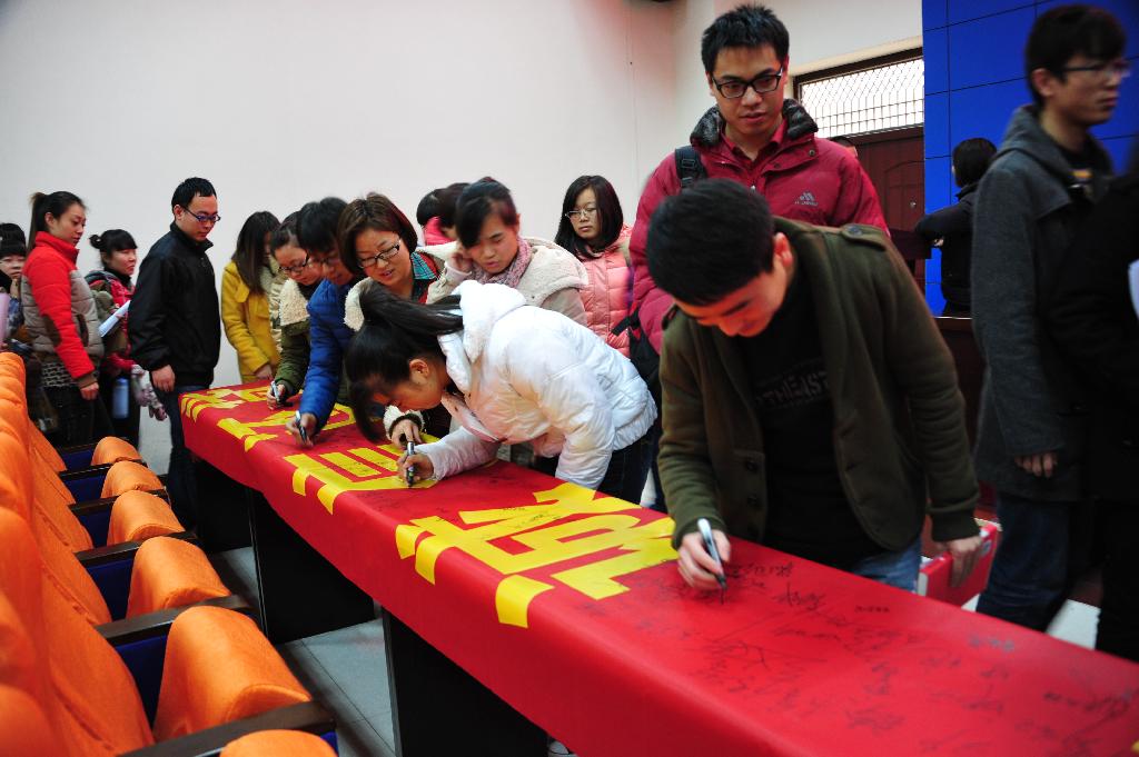 本网讯 12月19日下午,公司2013届毕业生诚信还贷签字仪式在多功能报告厅举行。员工科科长翟文君、员工资助管理中心副主任王延锋、毕业班辅导员和获贷毕业生二百多人参加了签字仪式。