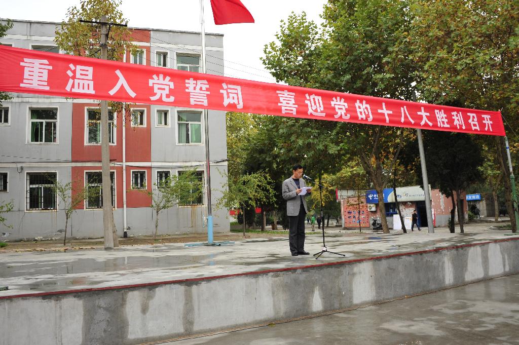 公司党委委员、学工部部长陈瑶参加了仪式并讲话,他指出,党的十八大召开既是我们党政治生活中的一件大事,也必将是我们党的建设和发展过程中的又一个里程碑。他向在场的全体党员提出了四点希望:一是当好先行者,即在学习、工作之余,认真学习领会会议精神,坚决拥护会议形成的决议,始终与党中央保持一致;二是当好宣传员,宣传党的理论、党的路线方针政策;三是当好实践者,即以本次会议为契机,进一步增强责任感和使命感,认真学习,勤奋工作,把会议精神贯彻好落实好;四是当好表率,希望大家牢记宗旨,在工作、学习、生活中处处严格要求自己,以身作则,起到模范带头作用,充分体现共产党员的先进性,以自己的实际行动向党的十八大献礼。