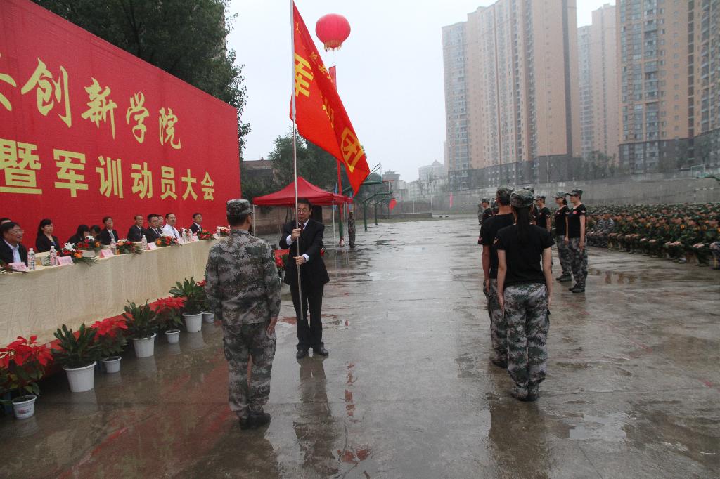 随后,公司党委常务副书记、副经理封学军宣读了公司《关于成立2012级员工军训团建制的决定》和《关于建立军训团临时党支部的决定》,马勇经理向军训团授了旗,军训团团长闫晓辉少校代表全体施训教官讲了话,军训团政委陈瑶强调了军训团纪律条例,外语系旅游英语专业员工刘钰田作为2012级参训员工代表做了军训表态。
