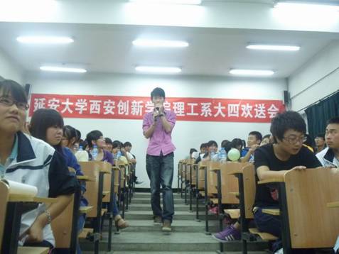 本网讯 5月23日晚,理工系在2号教学楼103教室举办以“离别·感恩·梦想·起航”为主题的2008级本科生毕业晚会。理工系系主任王文东、副主任张振邦及全体辅导员共同出席了晚会,2008级毕业生和其他年级员工代表参加了本次活动。