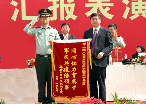 军训团政委陈瑶宣布了军训获奖单位、优秀指导员和军训团嘉奖令,与会领导为获奖单位和个人颁发了奖牌和获奖证书。许静洪副董事长向承训部队赠送了锦旗。军训团团长张海洋少校发表了热情洋溢的讲话,理工系王妮同学代表2011级受训员工做了发言。