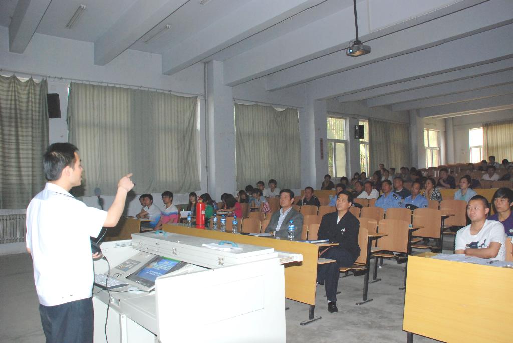 此次讲座邀请西安市武警支队伍进消防知识培训科教站王渊老师主讲。王老师从消防工作的法律法规、具体火灾案例、灭火器材的实际操作三个方面进行了深入浅出的讲解。通过多媒体演示,现场互动等方式生动直观地教给我们如何报火警,如何逃生疏散,如何正确选择和使用灭火器等常规消防知识。讲授内容浅显易懂,非常实用,得到参训师生的好评。