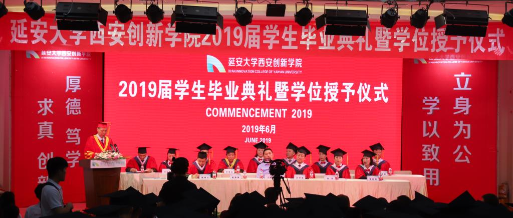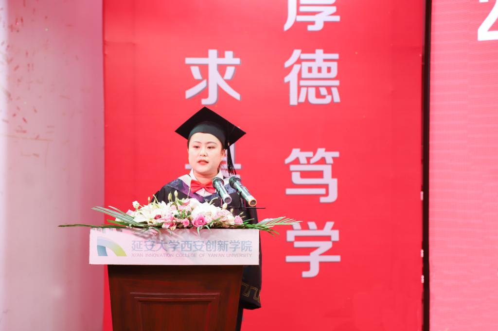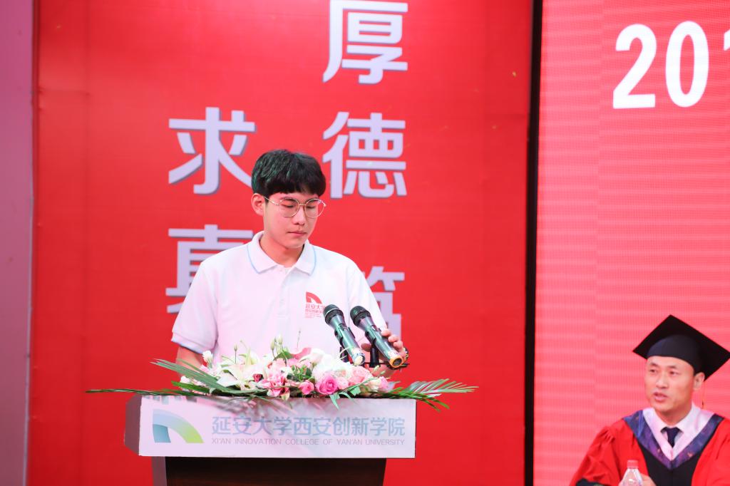 毕业生代表贺盼同学代表2019届全体毕业生感谢母校的辛勤培养,感谢校领导和老师的谆谆教诲,表示一定会牢记校训,并运用所掌握的专业技能,勤于实践,踏实做事,为母校增光添彩!