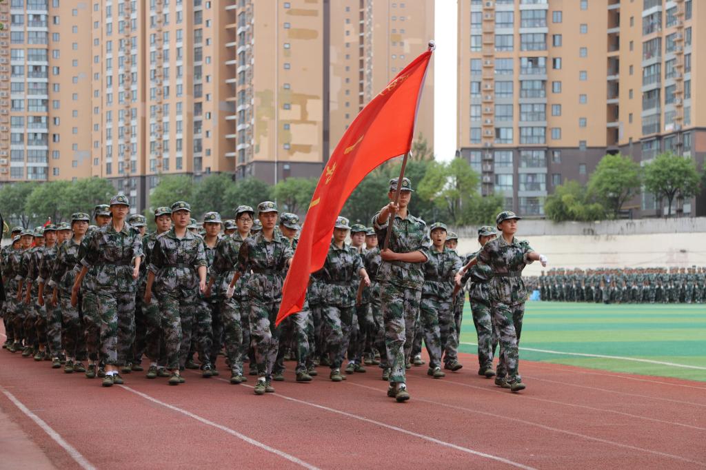 大会在雄壮激昂的国歌声中拉开帷幕,迎军旗仪式后,主席台人员起立检阅。嘹亮的口号声中,1600余名参训新生组成的受阅方队在军旗的引领下,昂首阔步依次走过主席台,接受检阅。