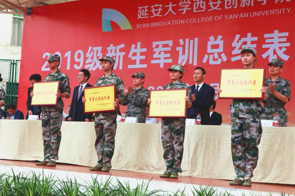 学工部部长、军训团政委丁晓宝宣读2019级军训团表彰决定。全体校领导为获奖连队及个人颁奖,执行董事长陈香山为承训部队赠送锦旗和纪念品。
