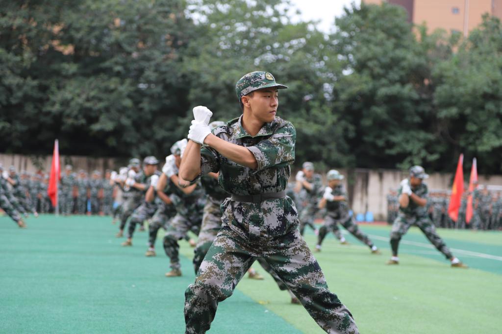 检阅完毕,军训科目汇报表演开始。军体拳方阵在《男儿当自强》的音乐中拉开帷幕,动作干净利落,斗志昂扬;单个军人徒手队列动作表演展示了稍息立正跨立、停止间转法、齐步走的行进与停止等基础科目的成果,体现了公司学子蓬勃向上的精神风貌;匕首操方阵的姑娘们拿着仿真匕首频繁地交换着插、刺、撩、割每一个动作,目视前方,眼神坚定,铿锵玫瑰在绿茵场上尽显英姿;男子擒敌拳方阵有力的呐喊响彻操场,他们手脚并用、摔擒合一,整套格斗动作行云流水,“打”出了创新好男儿的英雄气概。全体军训新生们齐唱《强军战歌》,激情似火,以独具风格的“中国70”队列变换献礼创新,喜迎伟大祖国70周年华诞。