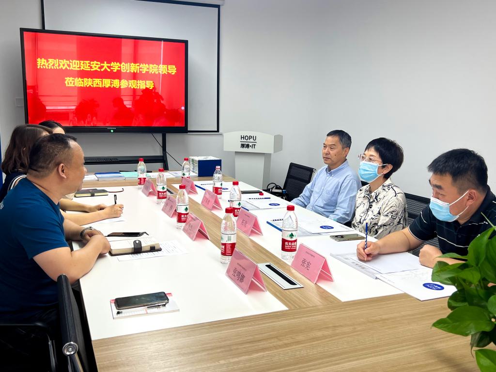 陕西厚溥教育科技有限公司负责人叶静与西安软通动力技术服务有限公司校企合作总监郝少杰分别介绍了公司的发展历程、主体业务、企业文化和人才招聘等情况,表达了与公司开展多方面的深入合作的意愿。拓欣和陈德分别介绍了公司的办学情况和英语专业特色与培养目标,双方就合作模式、合作力度展开深入探讨。拓欣表示,高校与企业有着诸多共性,如校园文化与企业文化、高校教学理念与企业服务理念、线上线下混合式教学方式、实习实训、创业孵化等,企业上的一些做法值得高校学习。我们要加强校企深度交流,及时了解社会与市场需求,不断改进人才培养方案,培养符合社会需求、能力满足企业的人才,要求进一步找准高校与用人单位合作切入点,探索校企合作新模式,提高员工专业技能,促进高质量就业,拓展就业空间。