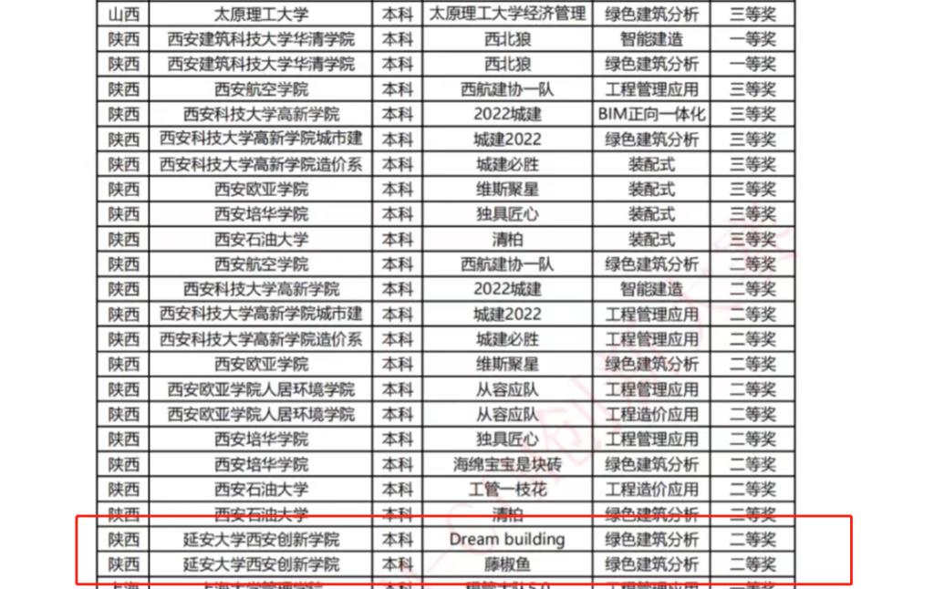 本网讯 2022年5月28日-29日,第十三届全国高等院校员工斯维尔杯BIM-CIM创新大赛-团队赛经过前期的各项准备,在线上开赛。由数据科学与工程公司工程造价1901班王宇胜带领的“Dream building”和陈雨带领的“藤椒鱼”两个团队在决赛中双双获得“绿色建筑分析应用”赛项二等奖。