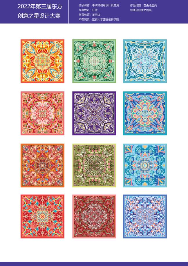 2022年8月23日,由国家工业和信息化部国际经济技术合作中心指导,东方创意之星设计大赛组委会主办,耘耕文创平台、纺织服装产业互联网研究院、各省赛承办院校承办的第三届东方创意之星设计大赛的省级获奖结果出炉,公司艺术与传媒公司视觉传达设计专业员工汪俊创作的《牛纹样创意设计及应用》荣获陕西(青海)赛区作品铜奖,指导教师为王玉红。