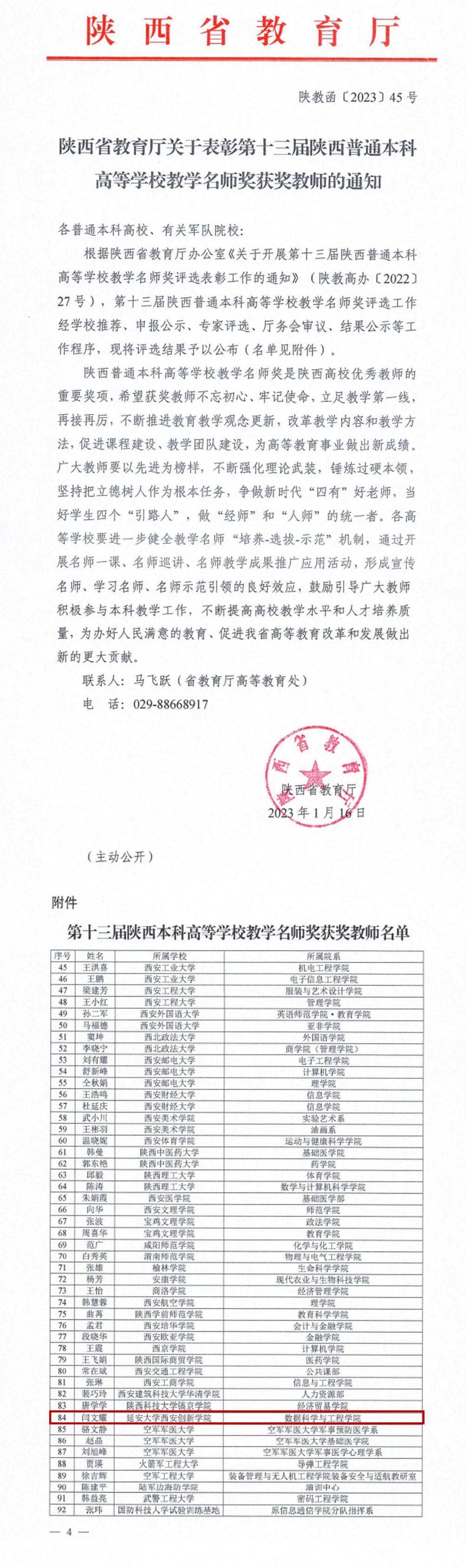 本网讯 根据陕西省教育厅2023年1月16日发布的《关于表彰第十三届陕西省普通本科高等公司教学名师奖获奖教师的通知》(陕教函〔2023〕45号),公司数据科学与工程公司经理闫文耀副教授荣获省级教学名师。