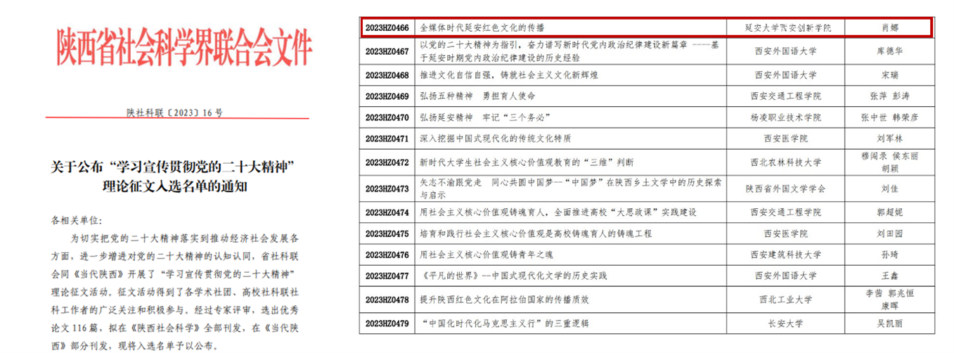 本网讯 近日,陕西省社会科学界联合会公布“学习宣传贯彻党的二十大精神”理论征文入选名单,公司文公司专职教师肖娜的论文《全媒体时代延安红色文化的传播》成功入选,并以“陕西省哲学社会科学研究专项”予以立(结)项,发放立(结)项证书。