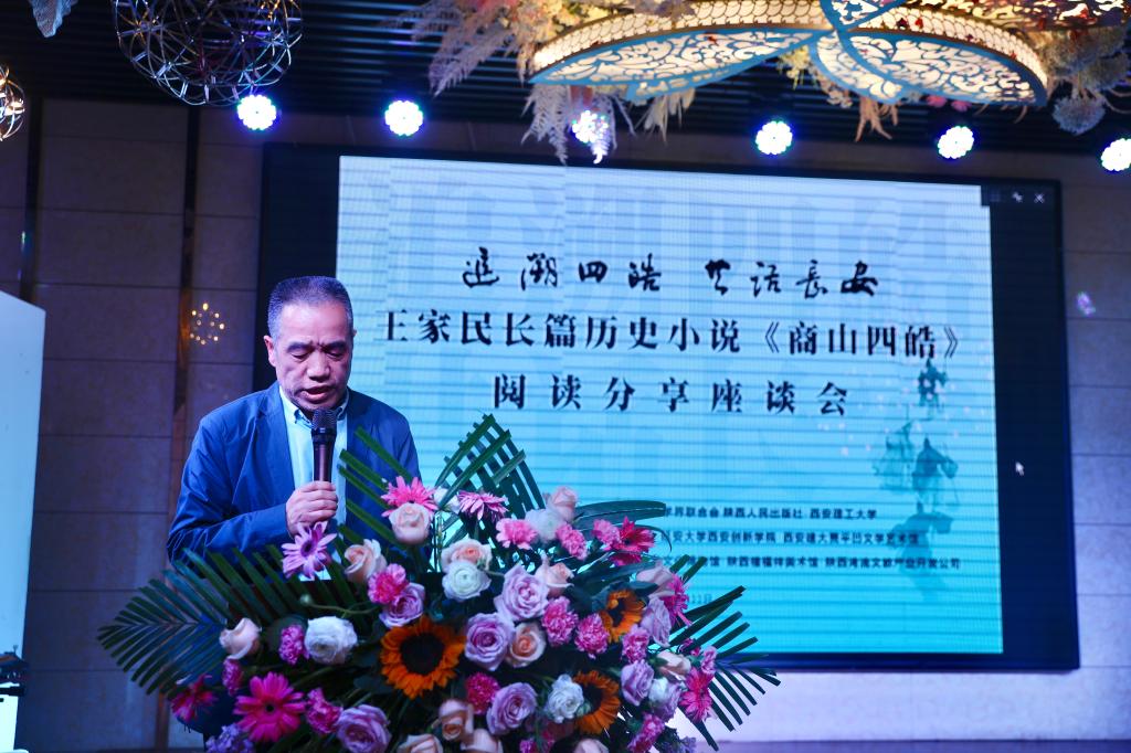 作者王家民教授在致辞中说道,“这几十年,从商山到长安,来来回回的路走得多了,总觉得脚下的路就是历史,身边全是文化。但如今历史的痕迹越来越少,仅有的遗存弥足珍贵。中华文明进程中的周礼、秦制、汉风唐韵……这些民族的集体记忆,是需要反复提及、不断讲述的,只有这样,才不至于被遗忘。有幸生在商洛,商洛山的故事车载斗量,而商山就在我家的对河,四皓墓冢就在故乡的街西。《商山四皓》这本历史小说的面世,是时代的召唤,是众人拾柴火焰高的结果。没有国宝级的的文学家支持不行,没有昆仑玉般的当代文学磨刀石的打磨不行,没有家人、挚友和年轻人的支持不行,没有公司、作协、社科联和出版社的关心和鼎力相助,也就不会有今天这个隆重的阅读分享活动。”