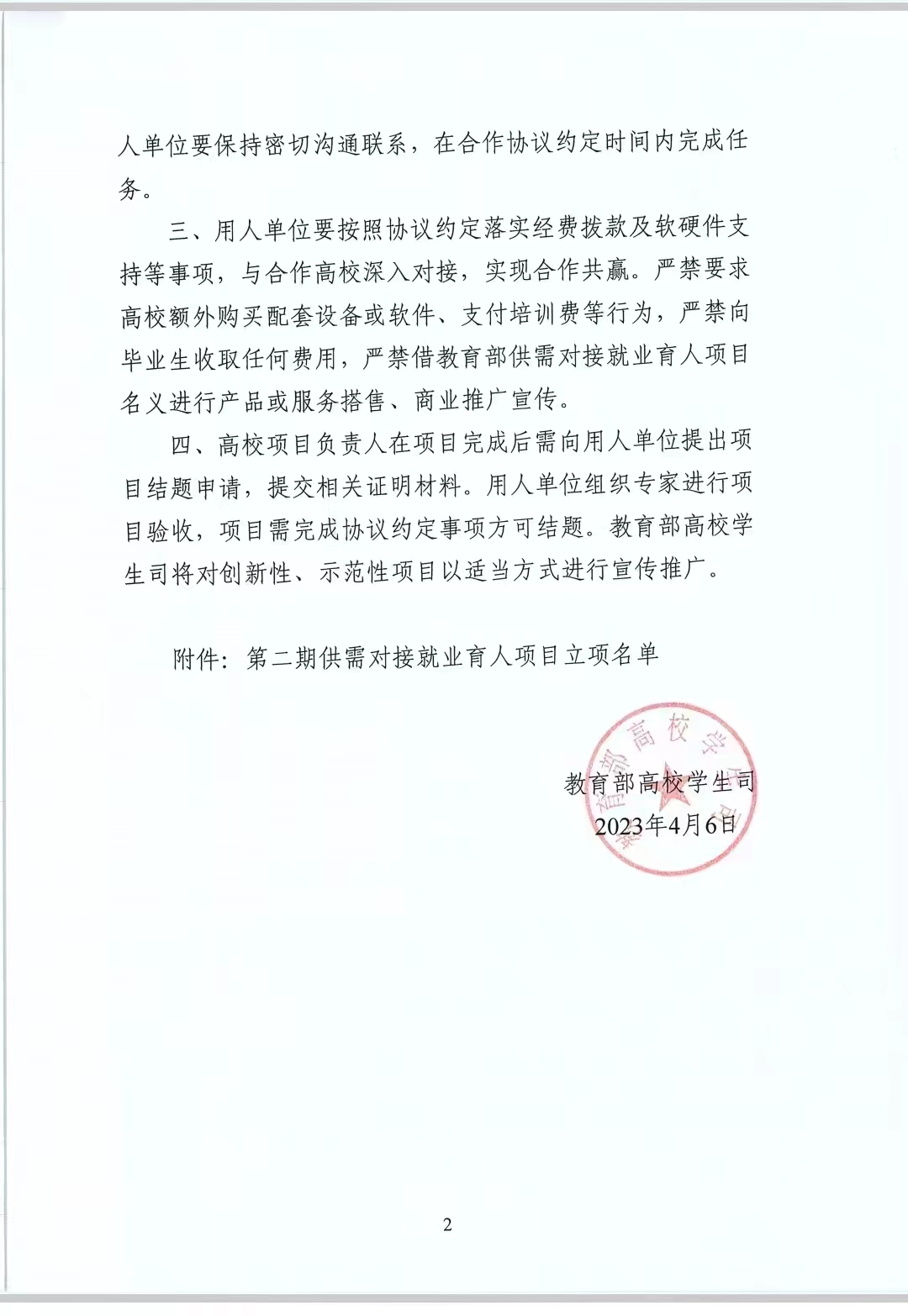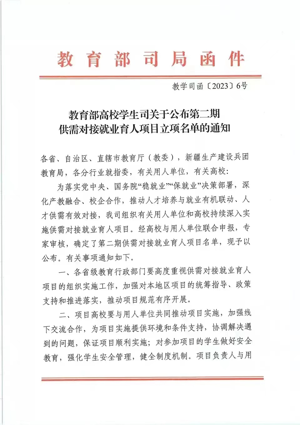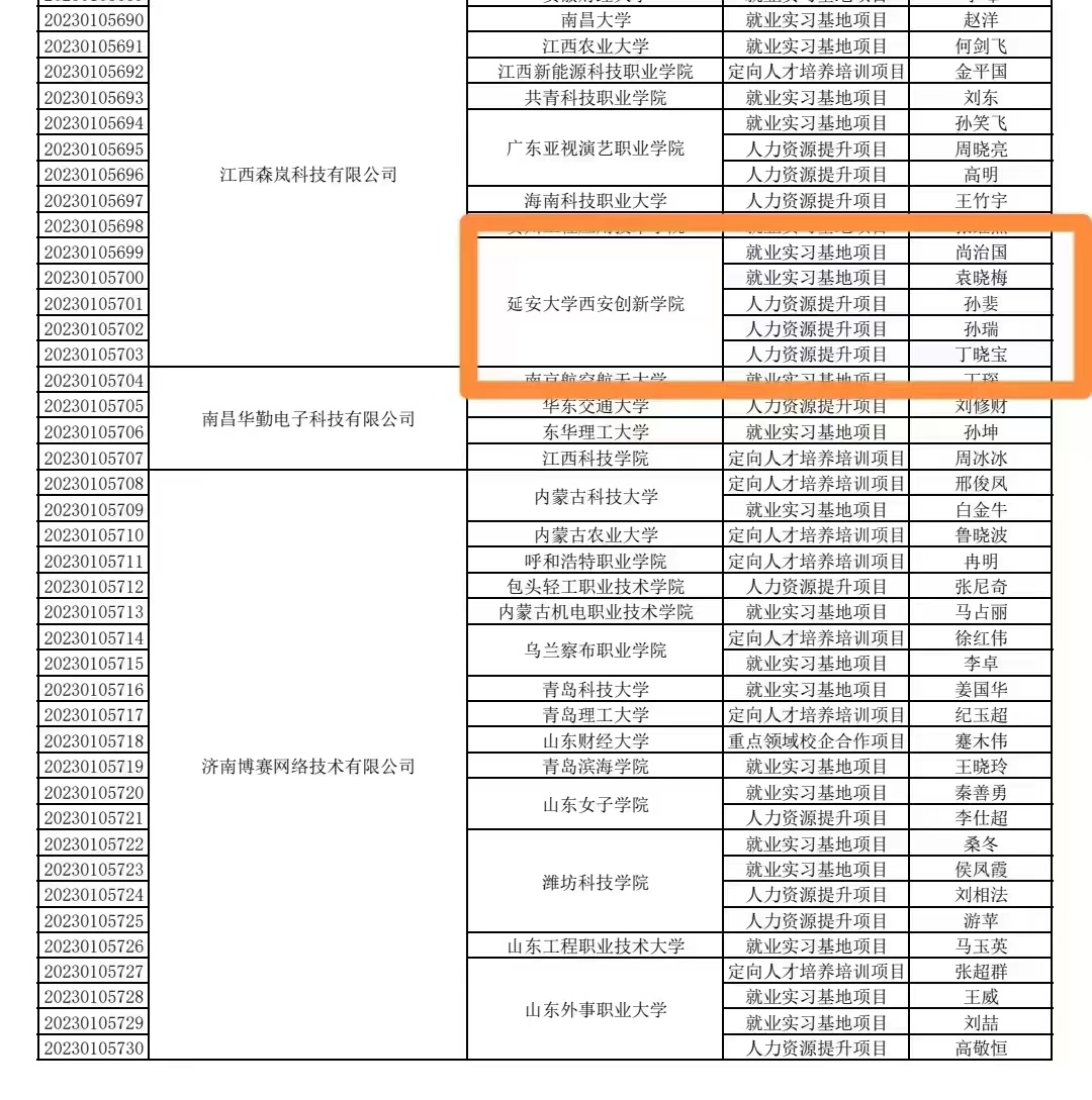 本网讯 4月6日,教育部高校员工司印发了《关于公布第二期供需对接就业育人项目立项名单的通知》(教学司函〔2023〕6号),公司12项供需对接就业育人项目获批立项,其中就业实习基地项目6项、人力资源提升项目5项、定向人才培养项目1项。这是公司首次参加并获批教育部供需对接就业育人项目。