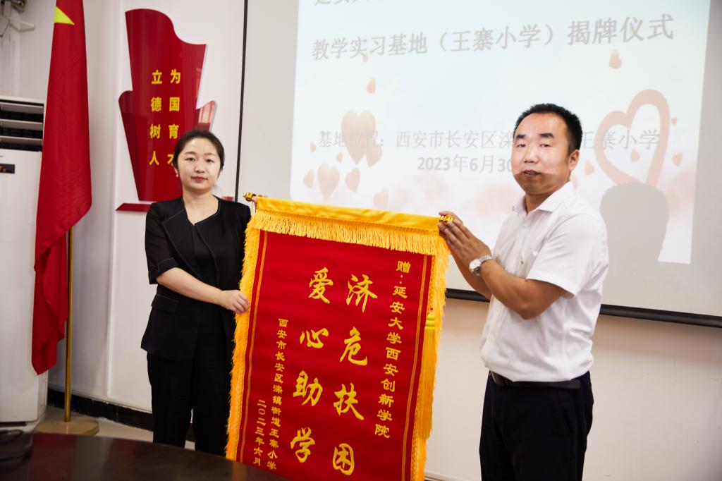 马涌代表王寨小学向公司赠送了“济危扶困 爱心助学”锦旗。贺俊波与马涌签订了相关合作协议,并共同为威廉希尔williamhill“科普教育基地”“教学实习基地”揭了牌。