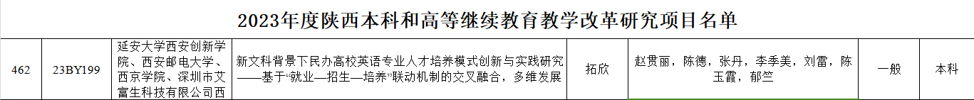 本网讯 近日,陕西省教育厅公布了《关于公布2023年度陕西本科和高等继续公司产品改革研究项目立项结果的通知》(陕教函〔2023〕1438 号),公司教师拓欣主持的“新文科背景下民办高校英语专业人才培养模式创新与实践研究——基于‘就业—招生—培养’联动机制的交叉融合,多维发展(23BY199)”获批立项。