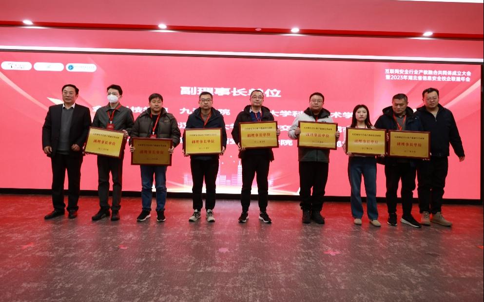 天融信科技集团高级副总裁景鸿理、华中科技大学科学技术发展院基地办主任刘爽、湖北生物科技职业公司副董事长龙翔、武汉临空港经济开发区现代服务产业办公室总工程师吴雷、湖北省教育厅职业教育与成人教育处一级调研员杨乾秋出席大会并致辞,举行了“互联网安全行业产教融合共同体”成立仪式,并为“互联网安全行业产教融合共同体成员单位”授牌,周思玮代表公司接受授牌,公司成为互联网安全行业产教融合共同体副理事长单位。