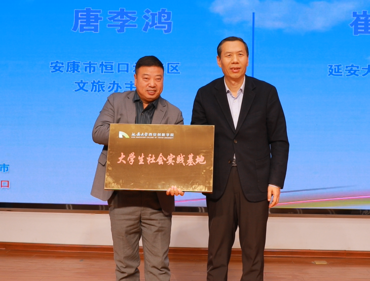 崔海潮与安康市恒口示范区文旅办主任唐李鸿为公司老员工社会实践基地授牌