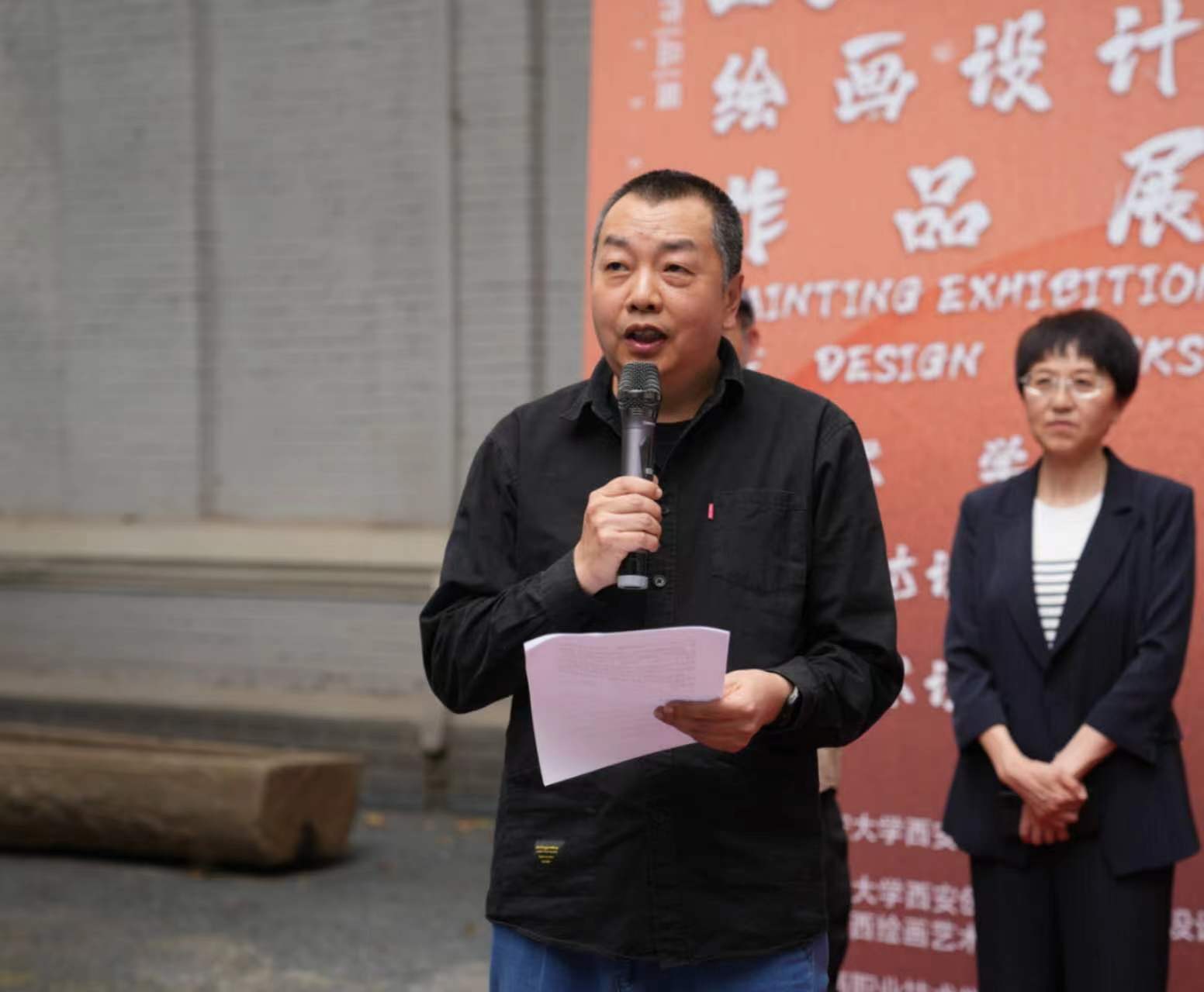 本网讯 为了鼓舞员工学习热情,更好地展示教学成效,使教学成果逐步产生社会影响,5月8日下午,艺术与设计公司在刘文西绘画艺术研究院展览厅开展了2024届员工毕业设计作品展开幕式活动。公司董事长崔海潮、执行董事长贺俊波、副董事长拓欣,艺术公司名誉经理王家民、执行经理赵雪伟,艺术公司徐步教授,陕西职业技术公司环境艺术公司经理张勇,陕西风华文化发展有限公司董事长孙英,校外各兄弟院校领导、企业家等出席开幕式,艺术公司全体教师与2024届毕业生参与开幕式,活动由常务副经理张恒主持。