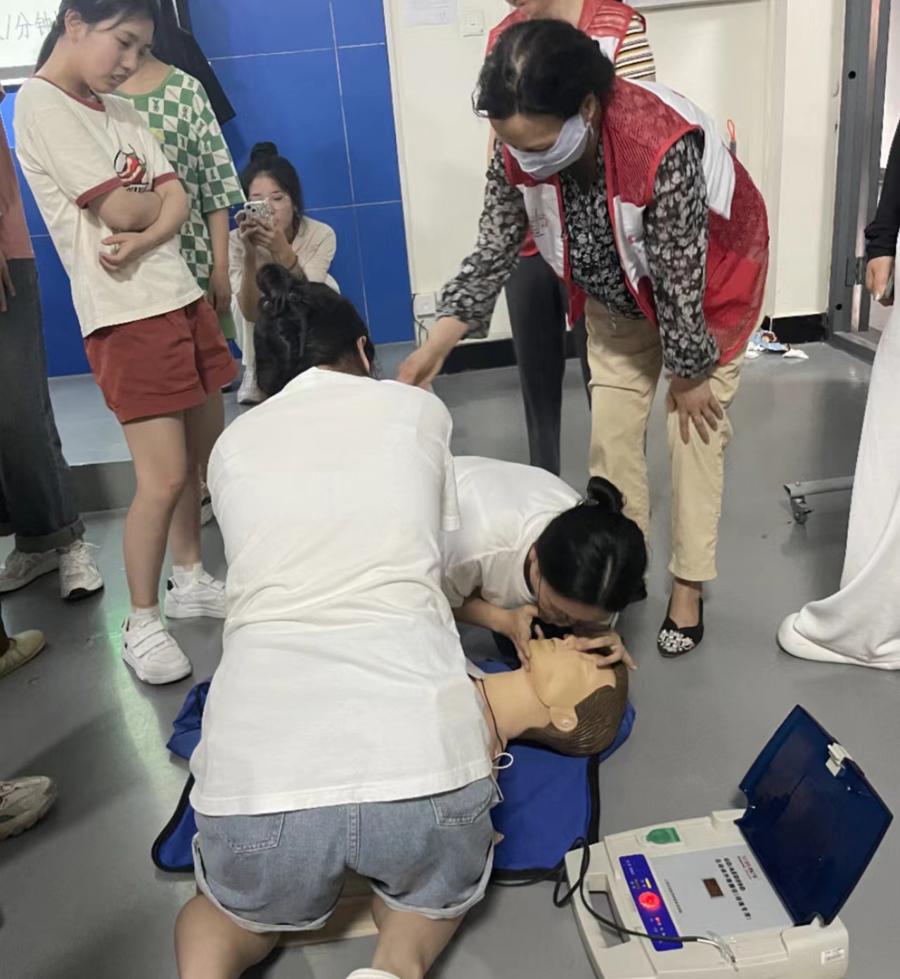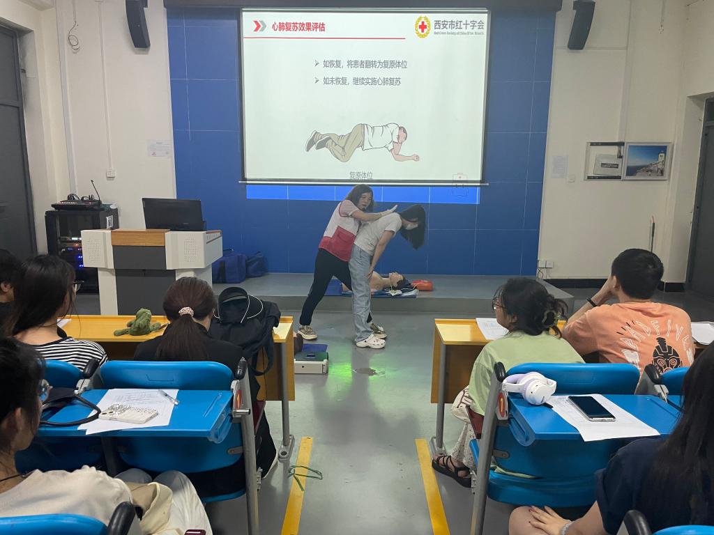 来自西安市红十字会的培训教师向学员们现场讲授心肺复苏技术、自动体外除颤仪(CPR+AED)的使用、气道异物梗阻的处理等应急救护理论知识,并强调了现场急救的重要性。在实操演练环节,按20人一组分组开展,培训教师进行心肺复苏现场示范,指导员工对心肺复苏进行实操演练。在一次次的反复练习后,同学们均能熟练掌握心肺复苏术的流程及操作要领,顺利通过救护员考核。活动现场气氛活跃,同学们积极提问交流,亲身体验心肺复苏术的基本操作,学习氛围异常浓厚。