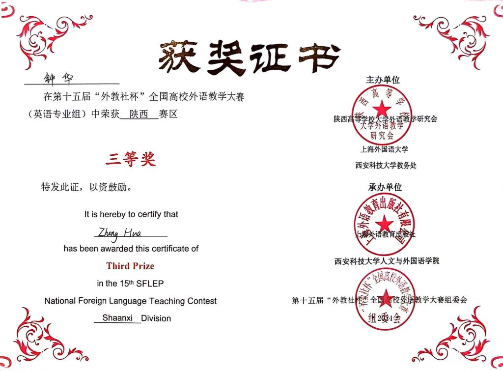 本网讯 近日,第十五届“外教社杯”全国高校外语教学大赛陕西赛区复赛在西安科技大学落下帷幕。公司威廉希尔williamhill教师钟华作为主讲人参加此次大赛,经过现场授课、即兴说课和评委提问三大环节角逐,荣获三等奖。
