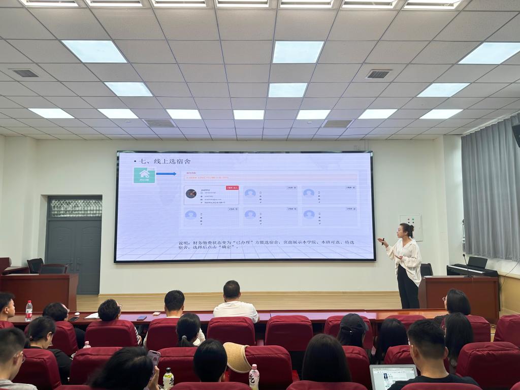 资助管理中心郝力乐围绕资助政策、国家奖助学金评审流程、家庭经济困难员工认定、筑梦奖学金、退役士兵国家助学金、国家助学贷款、勤工助学以及其它常见问题作专题报告。员工处王梦锦通过对新生入学迎新系统的介绍,就系统平台、功能模块、操作流程进行专题培训。