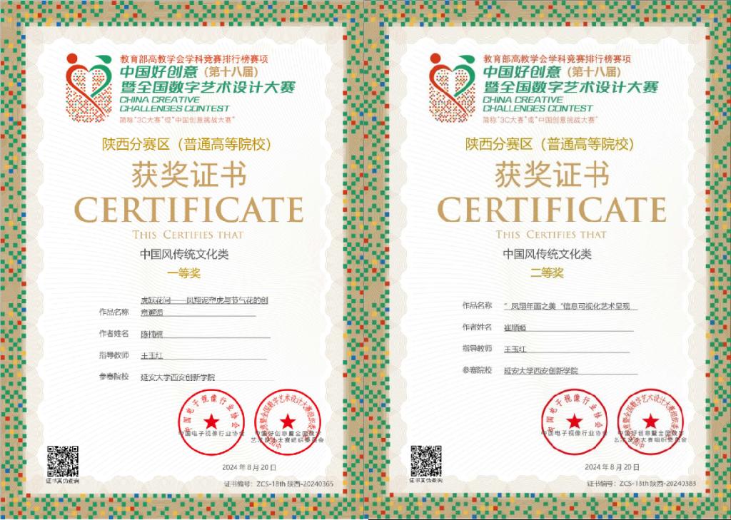 18.中国好创意暨全国数字艺术设计大赛荣获一等奖1项,二等奖1项,三等奖4项,特殊贡献奖1项。