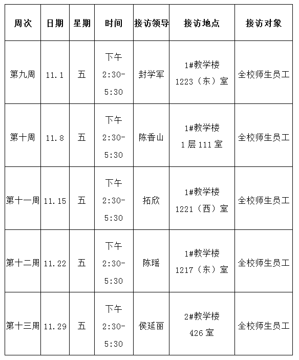 威廉希尔williamhill2019年11月校领导接访日安排表