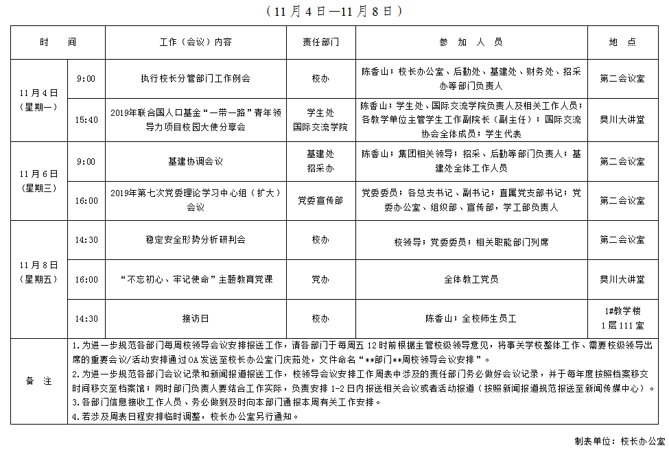 威廉希尔williamhill2019-2020学年第一学期第10周校领导会议安排表