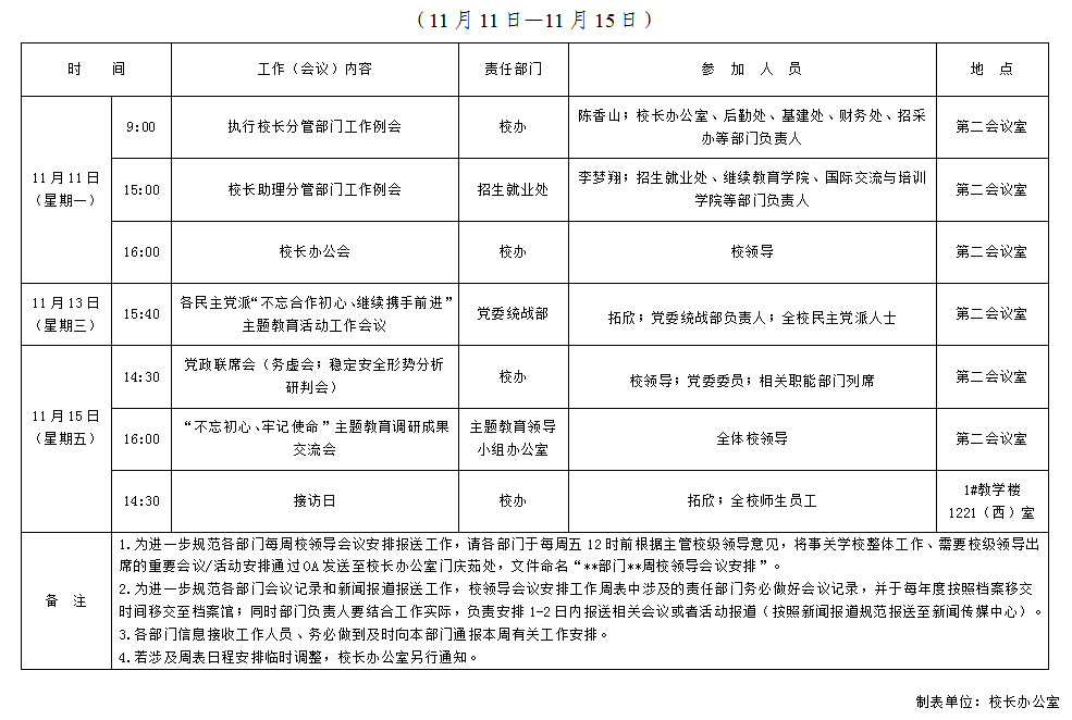 威廉希尔williamhill2019-2020学年第一学期第11周校领导会议安排表