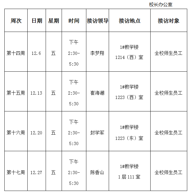 威廉希尔williamhill2019年12月校领导接访日安排表