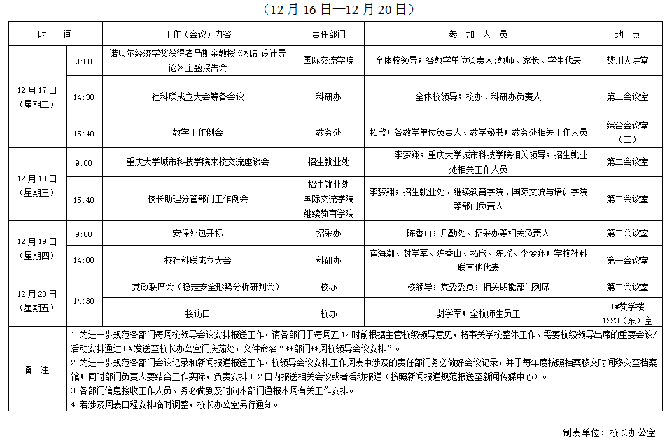 威廉希尔williamhill2019-2020学年第一学期第16周校领导会议安排表
