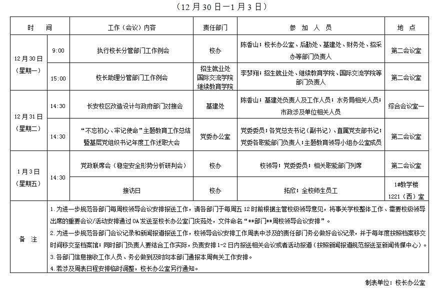 威廉希尔williamhill2019-2020学年第一学期第18周校领导会议安排表