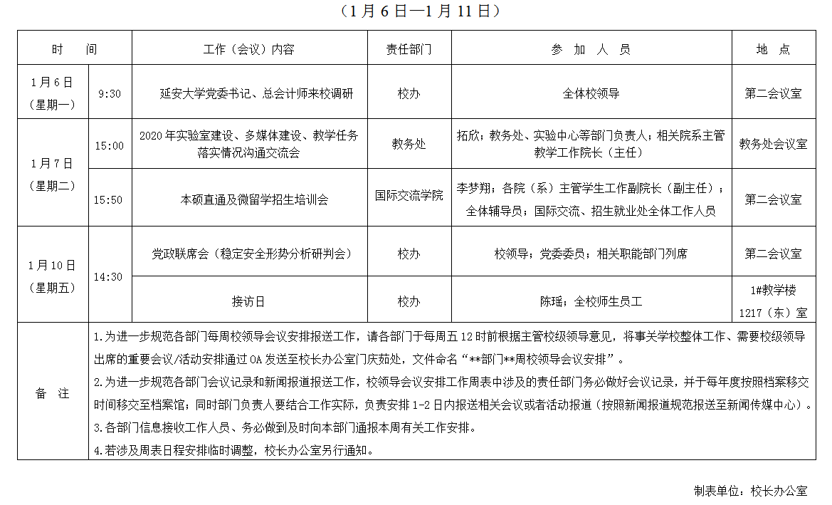 威廉希尔williamhill2019-2020学年第一学期第19周校领导会议安排表