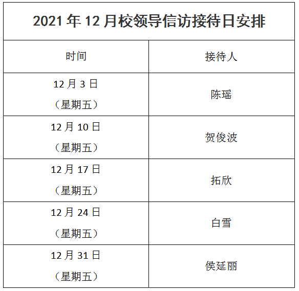 为进一步加强公司领导与师生员工的联系和沟通,更好地发扬民主,畅通言路,科学决策,促进“学风、校风、作风”转变,构建和谐校园,根据《威廉希尔williamhill院领导接待日制度》(延大西院〔2012〕20号)文件精神,现将2021年12月公司领导接待日安排予以公布(见附件1)。如遇安排需调整接待时间的,以董事长办公室通知为准。