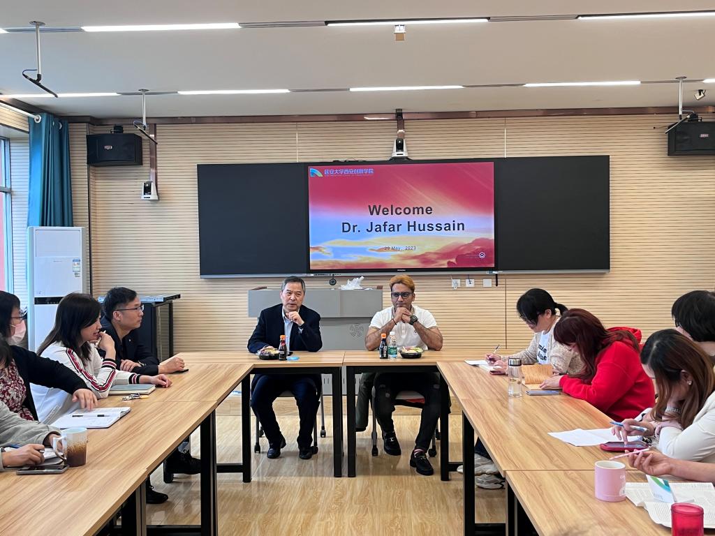 Jafar Hussain博士详细介绍了如何撰写在SSCI(Q1)期刊发表高质量论文,以及OMEGA(SSCI Q1)和RSER(SSCI Q1)杂志的审稿条件。他强调,学术研究和撰写论文是一个循序渐进的过程,需要按照一定的步骤进行,才能形成高质量、有学术价值和影响力的论文。Jafar Hussain博士还与现场师生就中巴文化、英语语言学习等方面进行了深入的交流探讨。大家踊跃提问,互相分享,现场氛围十分热烈。