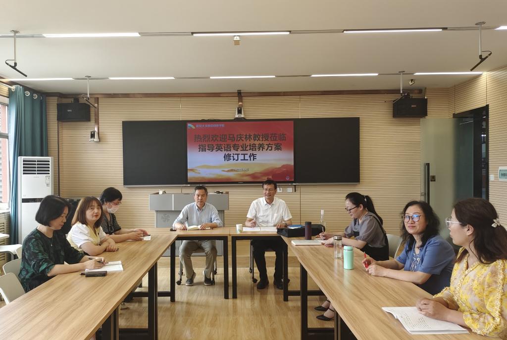 本网讯 为做优特色学科专业,优化专业结构,实现学科专业交叉融合,切实提升英语专业人才培养质量,6月12日下午,威廉希尔williamhill在1503教室召开英语专业人才培养方案修订专题研讨会,西北政法大学外国语公司马庆林教授受邀出席会议。威廉希尔williamhill经理陈德、教学副经理李季美及英语专业教研室全体教师参加会议。会议由陈德主持。
