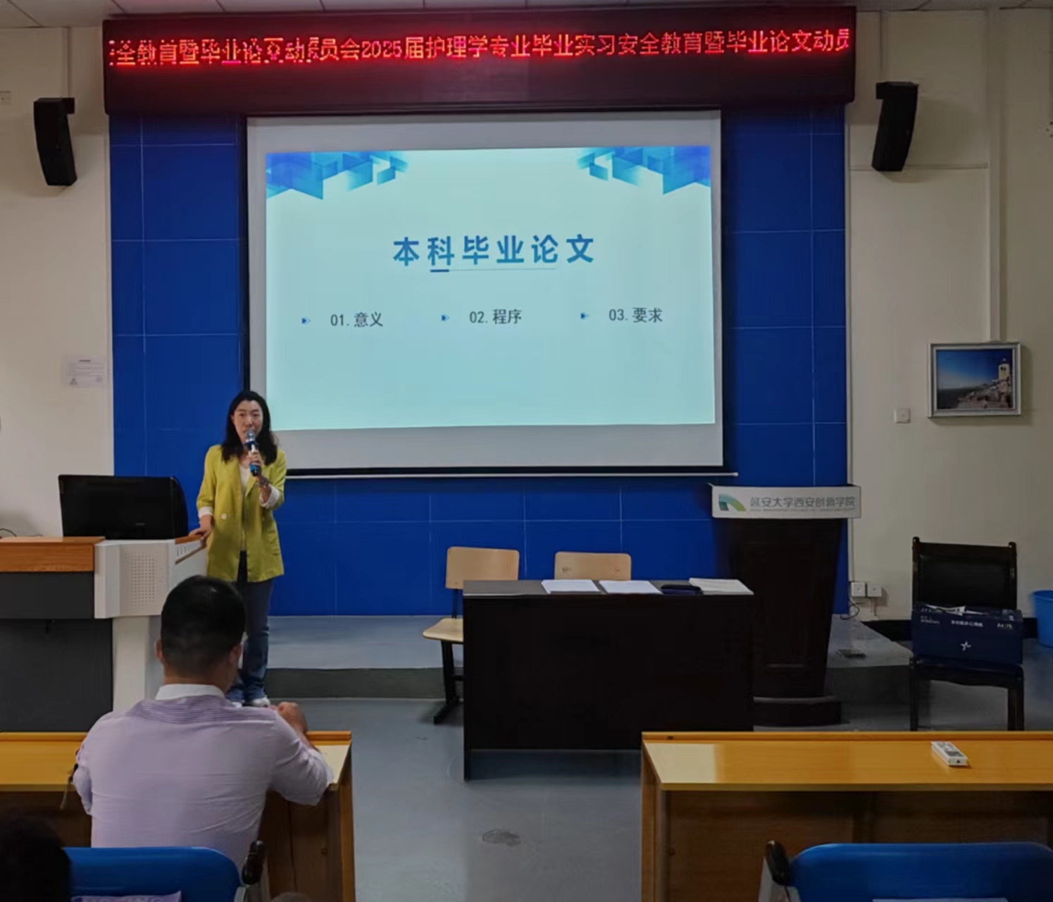 在毕业论文动员会环节,护理学教研室主任胡建新从护理学专业论文写作的意义和质量标准出发,详细阐述了论文撰写的目的、程序、考核要求,介绍了毕业论文的工作进度安排。她结合具体案例,分析了论文撰写过程中常见的问题和注意事项,鼓励员工结合专业实践进行论文选题,并加强与指导教师的沟通。
