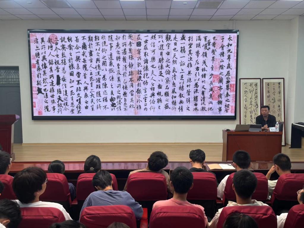 李海明教授讲解了书法的独特性,还剖析了《祭侄文稿》书写的力度、速度、质感等方面。他指出,《兰亭序》的书写一气呵成、浑然一体,流露出作者对生命的向往以及执着的热情,积极入世的人生观。他指出,汉字是书法的基因,书法的本质是文化,书法艺术是从书写文字中发展而来的,书法不仅能让人欣赏艺术上的美,而且还能让人感悟到生命的实质、情感的变化、精神的丰富。他以众多书法历史名家的人生修养和人格锻造经历为例,指出书法爱好者除了精于技之外,更重要的是文化涵养,文化才能使书法艺术从必然王国走向自由王国。
