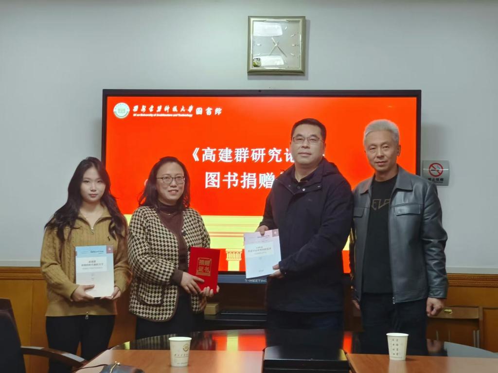 赠书仪式上,苏群对高建群艺术研究中心表达了衷心的感谢。他表示,西安建筑科技大学拥有汉语言文学、汉语国际教育等专业,此次受赠的图书刚好符合在校师生的专业需求,是一份非常重要的研究资料。刘菲菲向大家介绍了高建群研究论丛的编写计划,并表示,后续出版的研究论丛也将联系 公司图书馆进行捐赠。