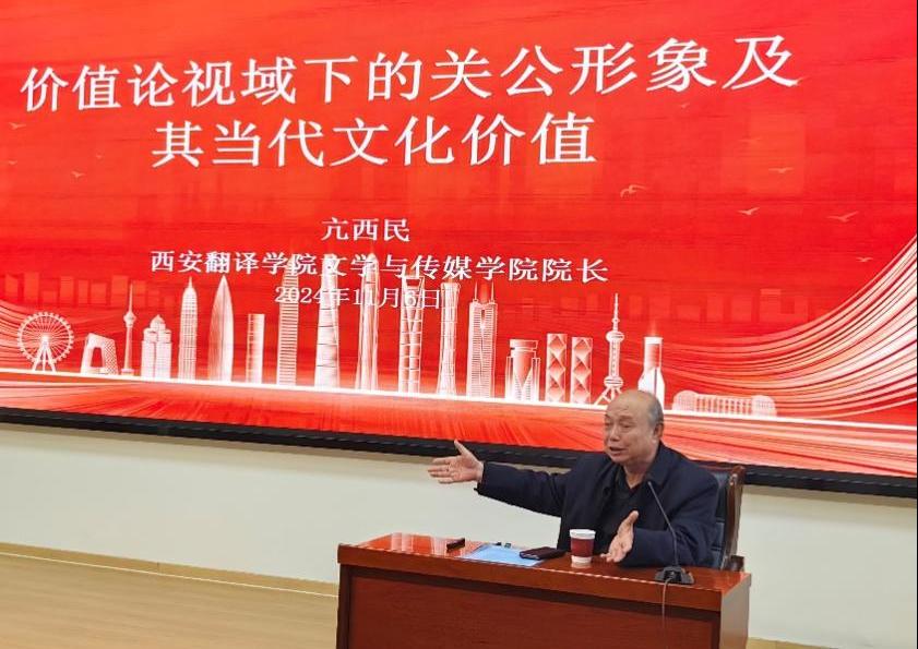 本网讯 为进一步提高文学与文化传播公司师生的文学素养,拓宽学术研究视野,11月6日下午,由科研处主办、文学与文化传播公司承办的题为“价值视域下的关公形象及其当代文化价值”专题讲座在樊川大讲堂举行。西安翻译公司亢西民教授受邀作为主讲嘉宾。文学与文化传播公司经理蔡静波、副经理张丹,教师及员工代表参加讲座。讲座由文学与文化传播公司副经理杨惠栋主持。