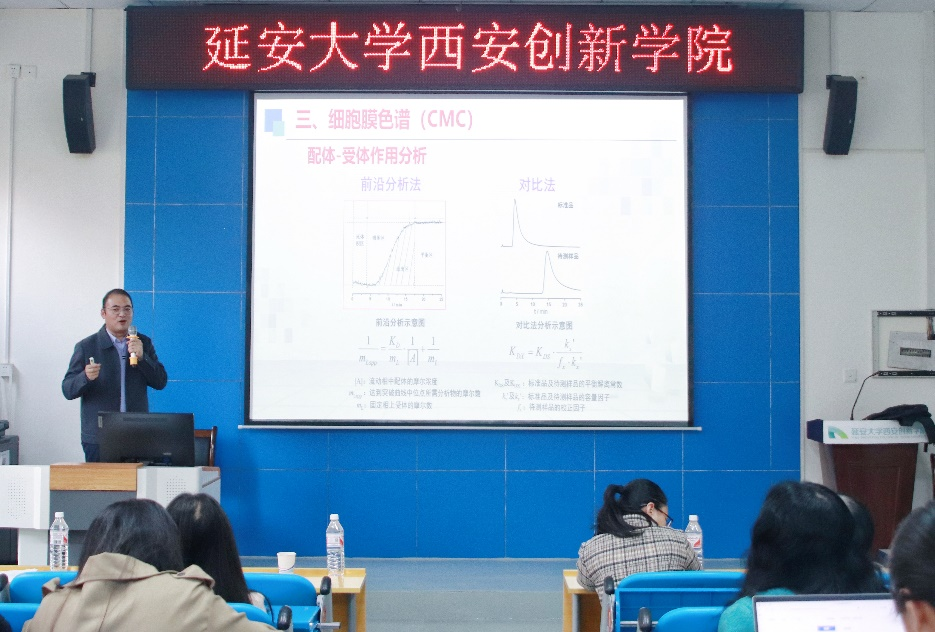 随后,韩省力教授从色谱技术的基本概念入手,详细阐述了液相色谱法的基本原理、操作流程及其在生物医学研究中的应用。他还特别介绍了细胞膜色谱(CMC)这一前沿技术,以及如何通过CMC模型优化来提高分析效率和准确性。最后,韩省力教授分享了CMC与分析装备的最新进展,为与会师生展示了色谱技术的广阔应用前景。韩省力教授结合丰富的实践经验,深入浅出地讲解了色谱技术的实际应用案例,让师生们对色谱技术有了更加直观和深入的理解。