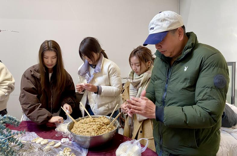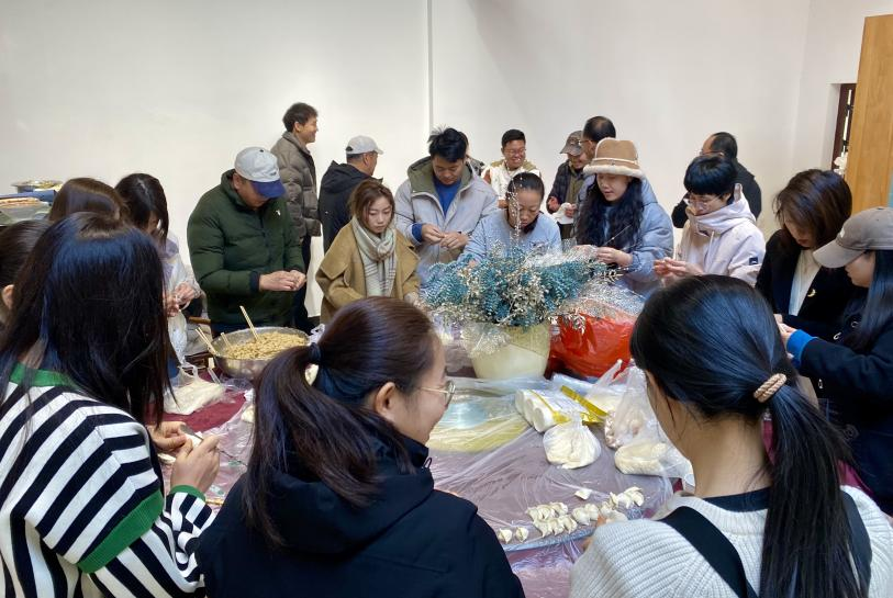 随后,刘丹、赵雪伟亲自带领师生们切菜、调馅、包饺子,师生们分工合作、各展所长,活动现场气氛热烈欢快。大家共享美味饺子,共话传统民俗。饺子素有“团圆美好”之意,通过“众手”协作,一盘盘美味的饺子汇聚着温暖和祝福。大家一边包饺子,一边唠家常,欢声笑语回荡迭起。