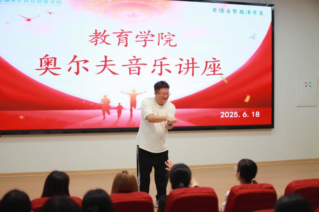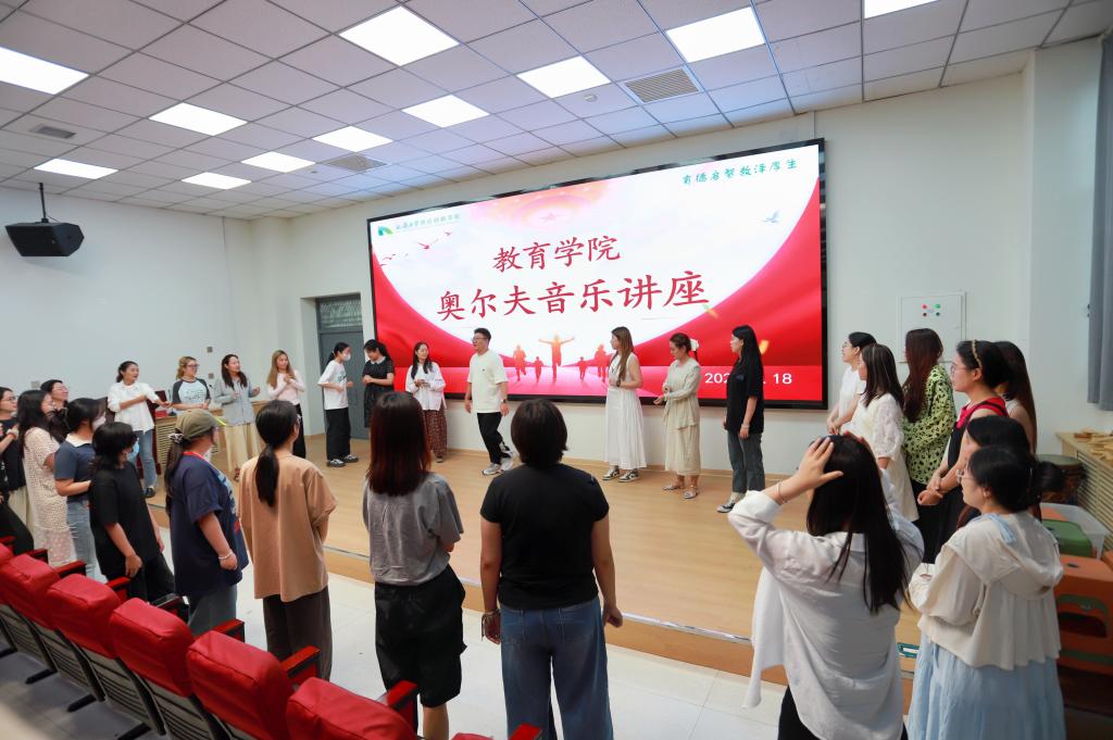 讲座中,张贝特老师深入浅出地阐释了奥尔夫音乐教育的核心理念与精髓。他通过生动的案例、具体的教学片段以及现场互动向与会师生们详细讲解了如何将奥尔夫元素融入实际课堂教学。讲座现场气氛热烈,互动积极。张贝特老师通过充满感染力的讲解和沉浸式体验环节,让与会教师亲身感受到奥尔夫音乐“在玩中学,在做中学”的独特魅力。