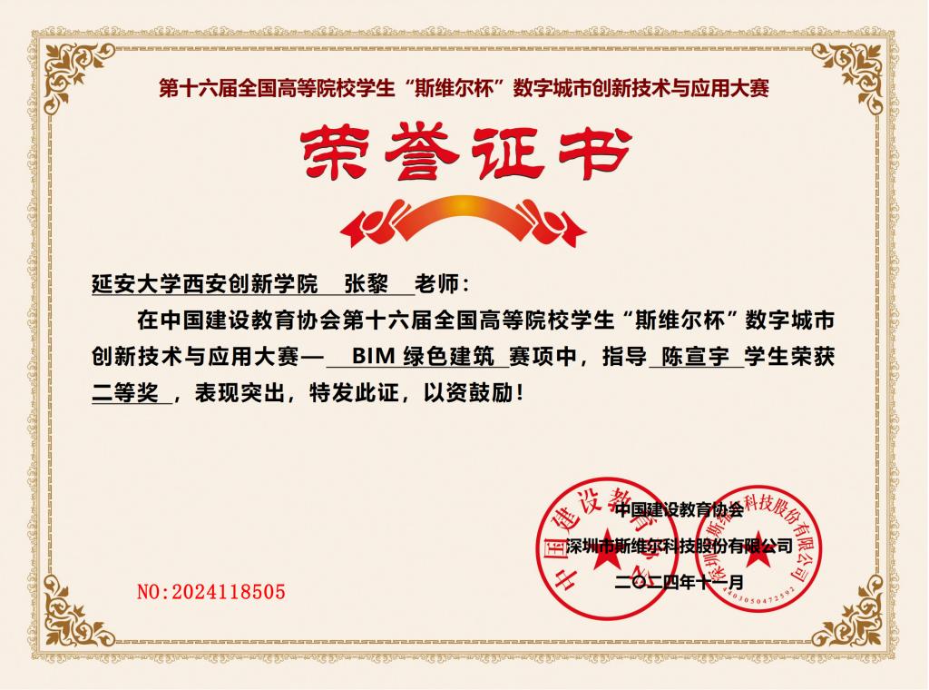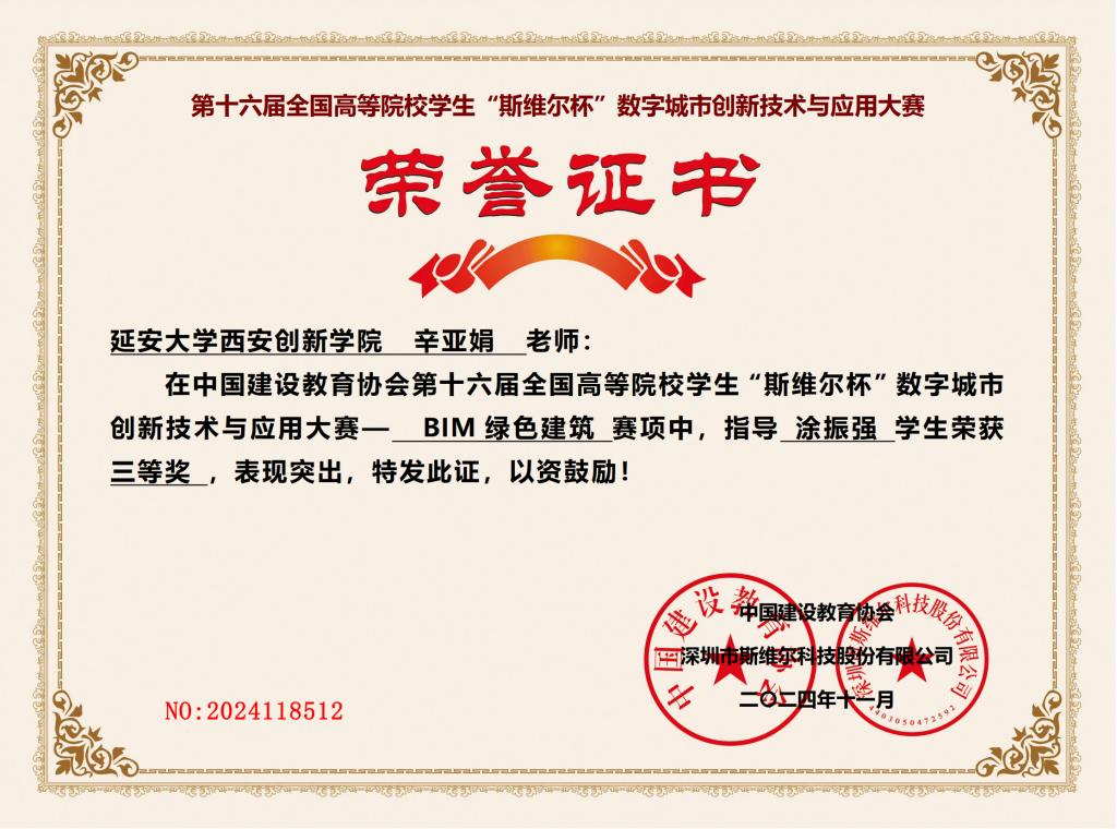 本网讯 近日,由中国建设教育协会主办、深圳市斯维尔科技股份有限公司承办的第十六届全国高等院校员工“斯维尔杯”数字城市技术创新与应用大赛个人赛传来喜讯。公司数据科学与工程公司土木工程专业2023级陈宣宇同学荣获二等奖,土木工程专业2023级何一恒、工程造价专业2022级樊冰姿和涂振强同学荣获三等奖。