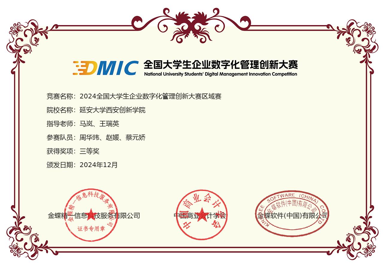 本网讯 近日,2024年全国老员工企业数字化管理创新大赛陕西省区域赛落下帷幕。此次比赛吸引了陕西赛区26所高校共74支队伍参赛。公司威廉希尔williamhill会计2201班何婧溢、王叶楠、吕翊君组成的“沙威玛队”和会计2411班周华玮、会计2412班赵媛、蔡元娇组成的“花儿朵朵队”均荣获省级三等奖,会计2202班陈琳娜、吴海旭、张家慧子组成的“梦想编制队”荣获省级优秀奖。