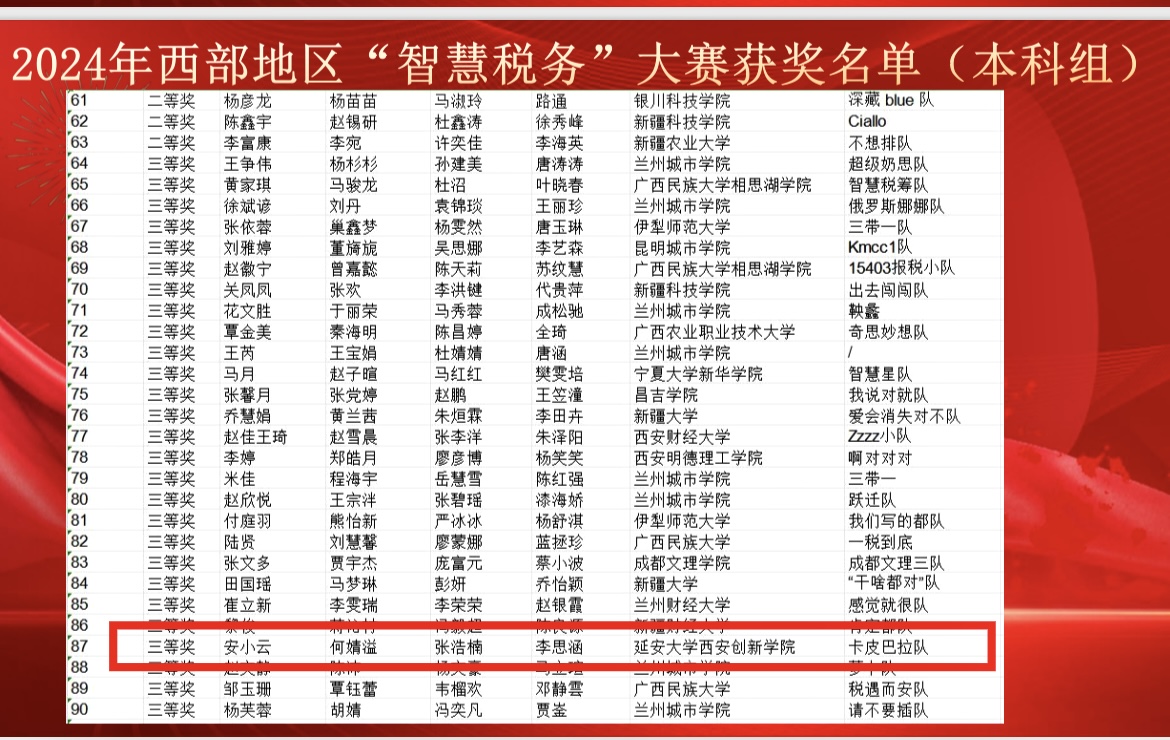 本网讯 12月15日,西部地区“智慧税务”大赛落下帷幕,威廉希尔williamhill会计学专业2202班张浩楠、安小云、李思涵和2201班何婧溢组成的“卡皮巴拉队”在教师罗萌、魏建丽的指导下荣获三等奖。