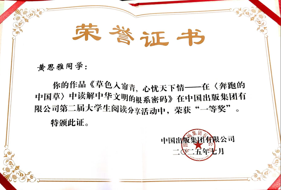 黄思雅同学的作品以独特的视角和细腻的笔触,将个人阅读体验与家国情怀相融合,获得了评委的一致好评。此次获奖不仅是她个人努力的成果,也是公司图书馆长期致力于阅读推广工作成效的具体体现,更是公司公司产品质量和育人成果的生动展示。